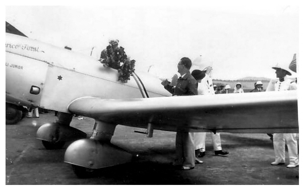 fleurs, entouré de couronnes offertes par ses camarades de l’Aviation sous